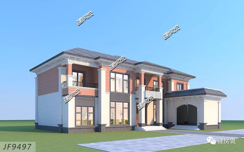 别墅外墙主体用米白色和橘红色真石漆装饰,屋顶是灰色西班牙瓦,整体显现了中式古典气质,内在布局又符合现代人追求的时尚感。