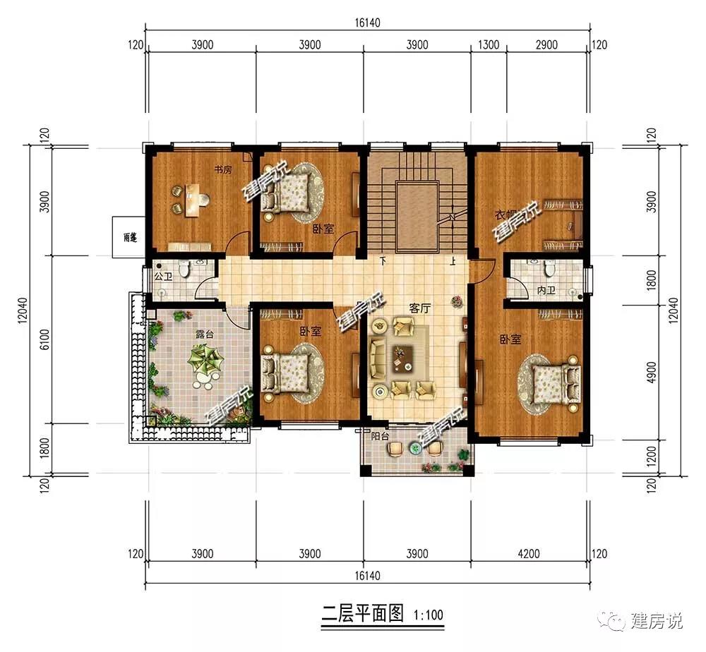二层:3间卧室,主次分明;书房,办公看书两不误;大露台满足晾晒需求;客厅可供家人交流感情。