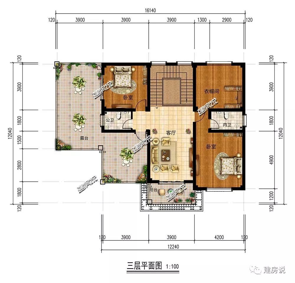 三层:2间卧室,主次分明;衣帽间统一收纳家中衣物;大大的露台,可以休闲娱乐。