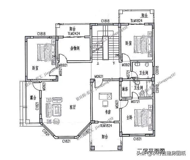 二层:朝南的主卧室为套间设计,带有卫生间、书房和阳台,方便主人公休息和办公。