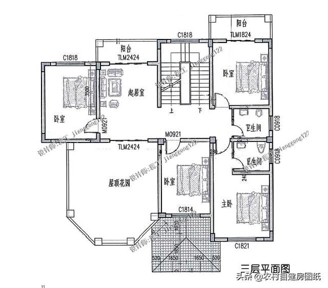 三层:设计有4间卧室,2个卫生间,另有起居室和屋顶花园。