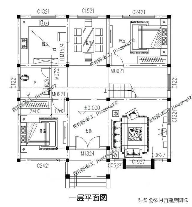 一层:入户门厅与玄关承接,客厅在一侧,厨房在西北角与餐厅连在一起。