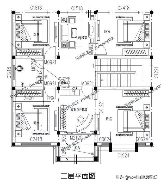 二层:设计有4间卧室,主卧室带有衣帽间和书房,方便休息和工作。