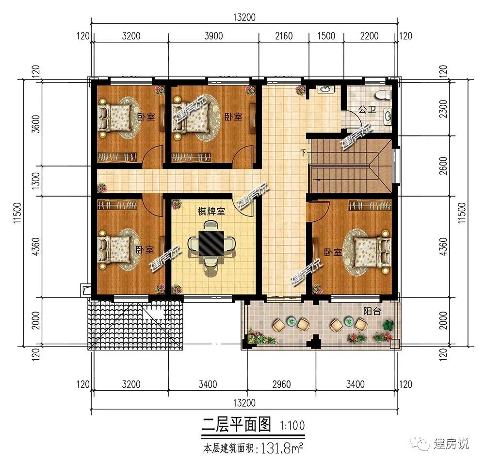 二层:4个卧室,满足家人起居需求;棋牌室促进家人交流,丰富日常生活;阳台观景、晾晒两不误。
