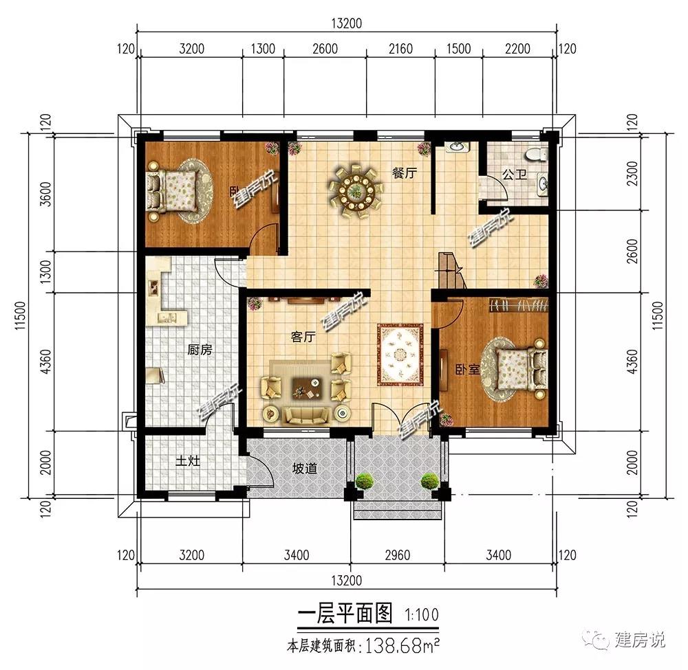 一层:客厅、餐厅空间宽敞,接待亲友也是极好的;2个卧室大小适中;厨房与土灶相连,布局紧凑合理。