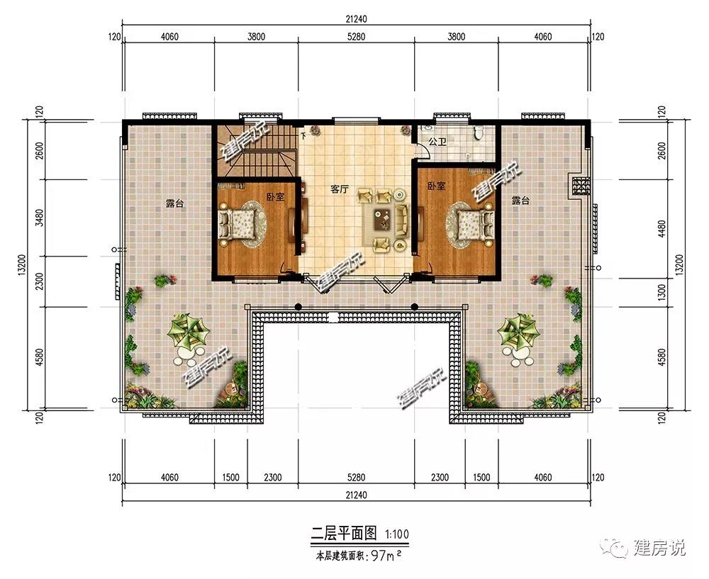 二层:2个卧室布局合理,温馨紧凑;客厅方便家人娱乐休闲,增进感情;宽敞的露台,让室外的视野更加开阔,可以养花种草,欣赏美景。