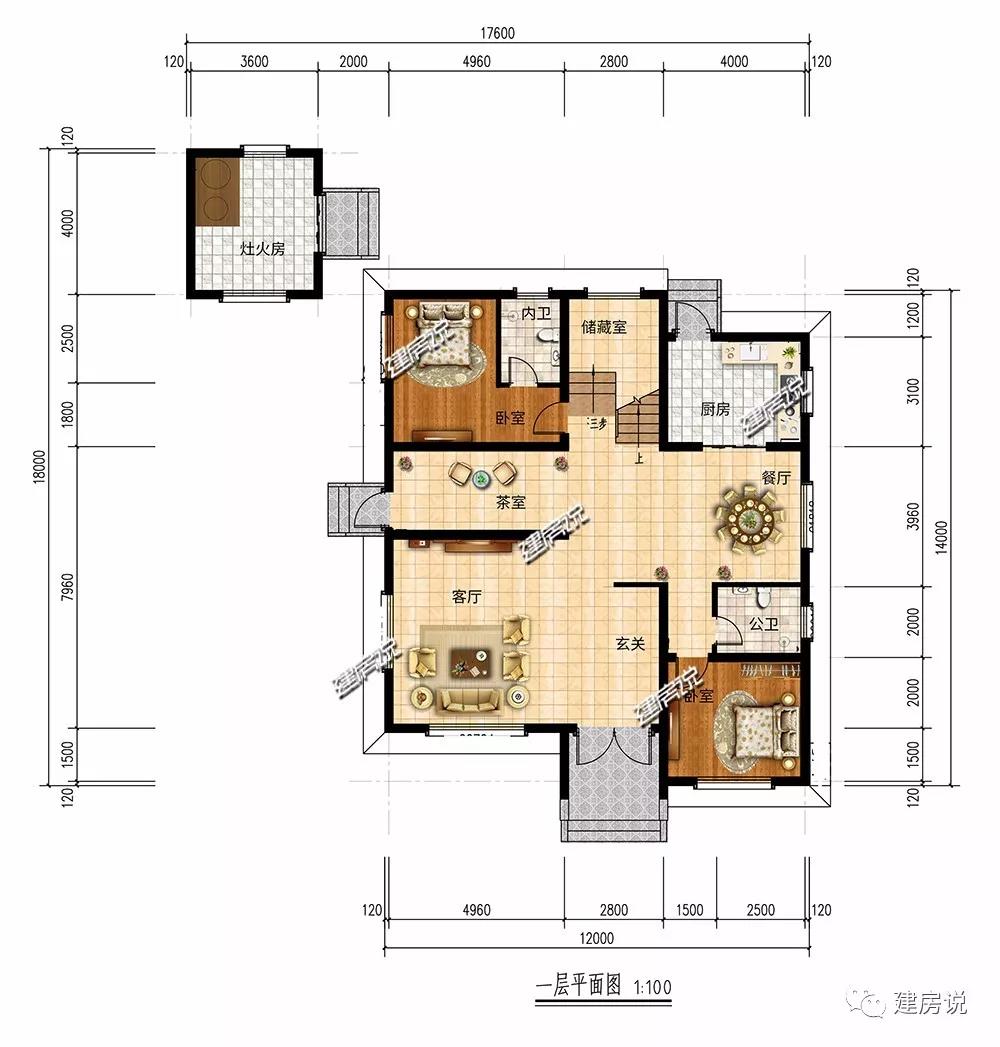 一层:入户设有玄关,客厅温馨紧凑,方便接待好友;设有分离的灶火房,干净卫生,做出土色土香的柴火饭。