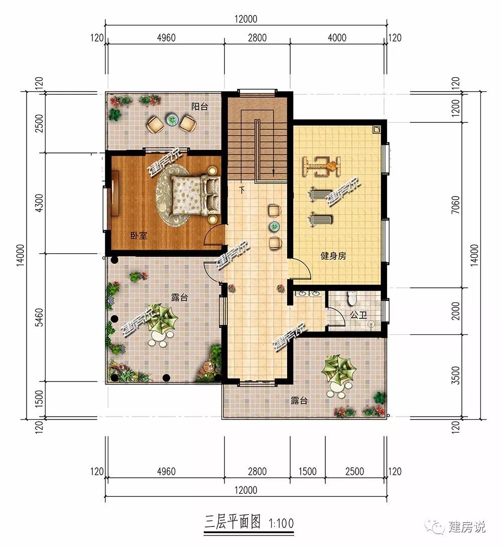 三层:1间卧室,与阳台相连,利于通风采光、观景等;健身房提高家人的身体素质;2个露台面积宽敞,晾晒观景两不误。