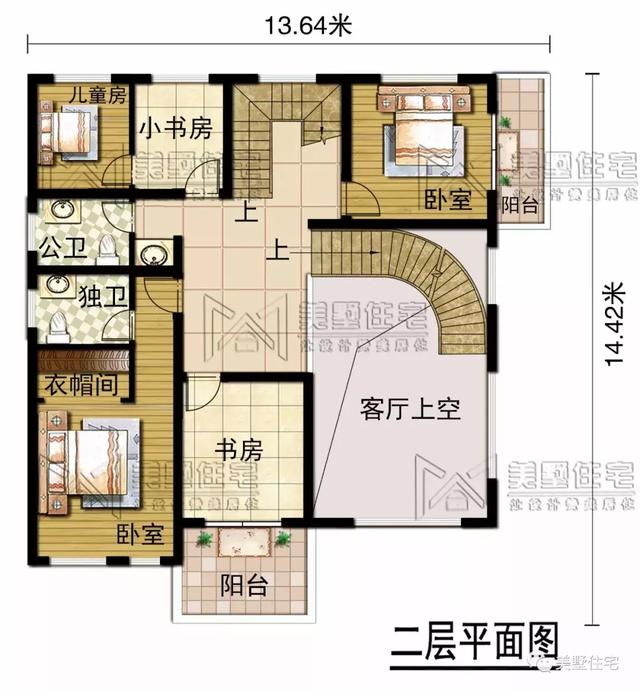 二层:设书房、衣帽间、三间卧室、两间卫生间、两个阳台。