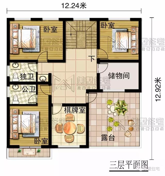 三层:设棋牌室、储物间、三间卧室、两间卫生间、一个露台、一个阳台。