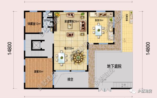 地下:半地下设有酒窖,餐厅,厨房,家庭影院,储藏室,公卫,电梯间。这一层为功能区,餐厅有一大一小两个餐桌,厨房内也有一个餐桌,方便使用。家庭影院方便平时观影娱乐。