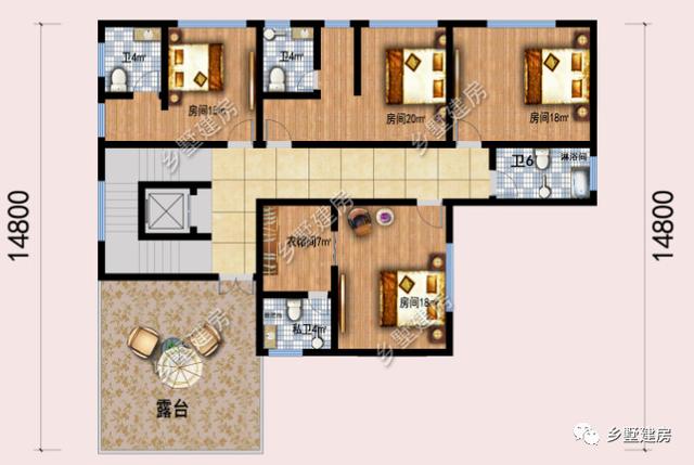 三层:设有四间卧室,一个露台,公卫。四间卧室可作为客房。阳台可以用于平时休息喝茶。