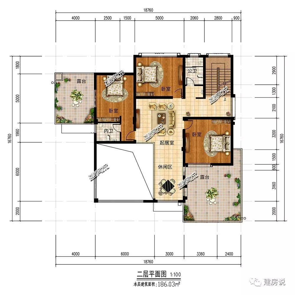 二层:设有3间卧室,主次分明;起居室满足家人日常活动;宽敞露台适合晾晒衣物,种植花草。