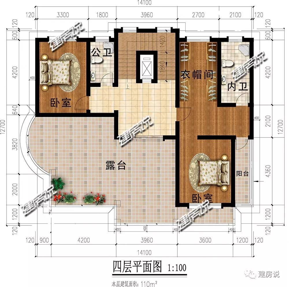 四层:设有2间卧室,主次分明;宽敞露台可供晾晒衣物,种植花草。