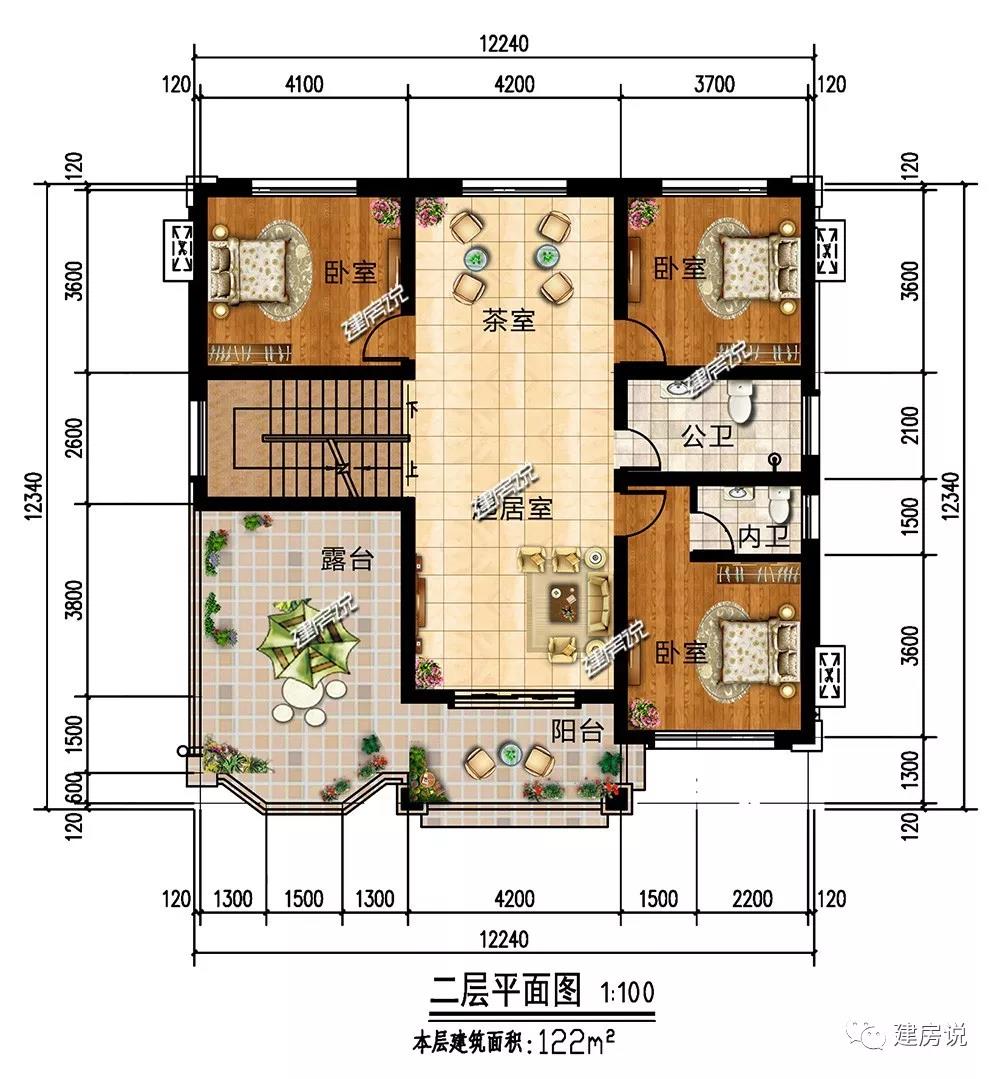 二层:设有3个卧室;起居室便于家人之间联络感情;露台面积宽敞,利于通风采光与日常晾晒等。