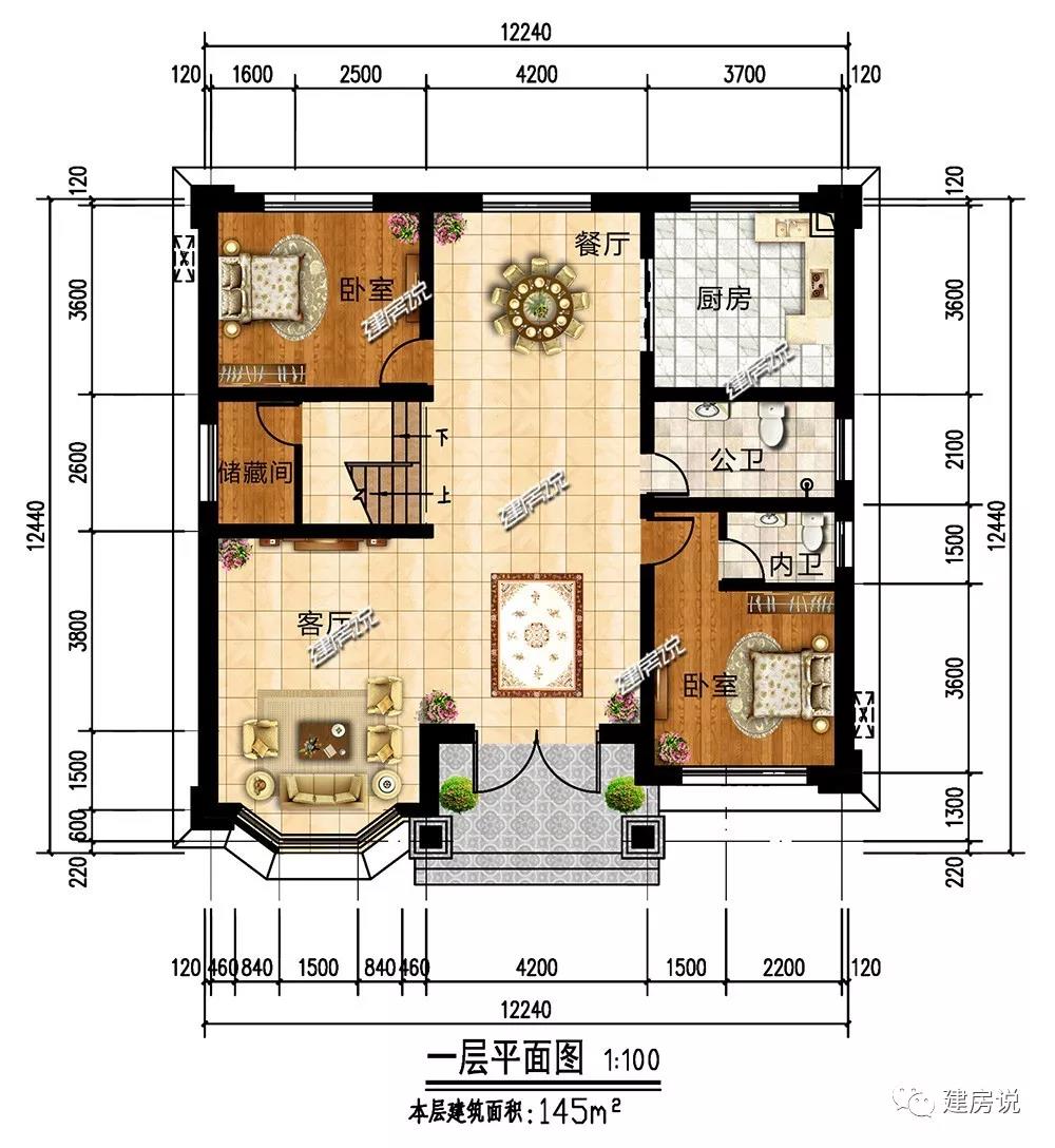 一层:入户即宽敞的客厅,方便接待亲朋好友;2个卧室主次分明;厨房、餐 厅划分在一侧,布局合理。