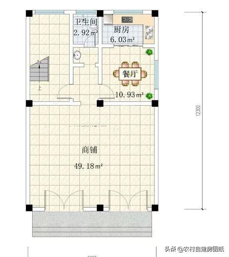 一层:由于建筑的开间只有8米,因此整个设计平面整体设计为双跨形式,南面的空间被设计为商铺门面房,可用于出租,商铺后面设计有厨房、餐厅和卫生间,方便租户使用。