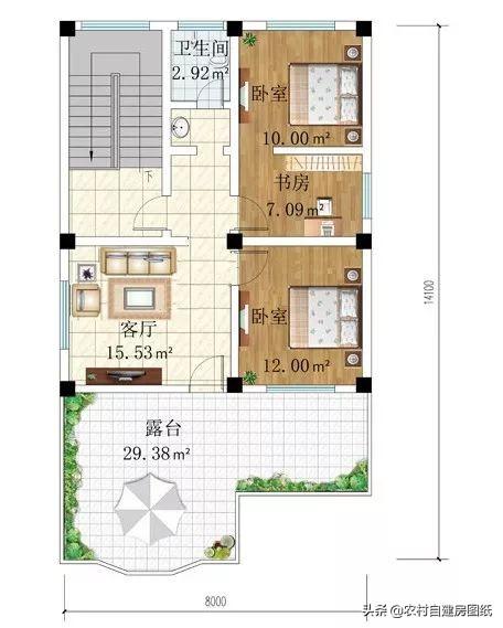 四层:设计有2间卧室,卫生间、客厅。宽敞的屋顶露台,可以用于观景和活动,洗衣后的晾晒。