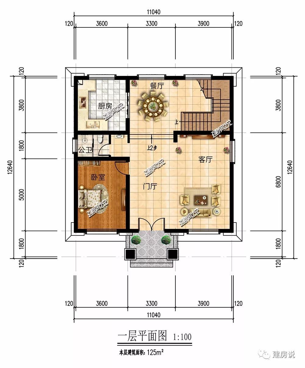 一层:入户是门厅,符合农村习惯;客厅宽敞舒适,方便接待好友;餐厅厨房划分一侧,布局合理;1间卧室可做老人房。