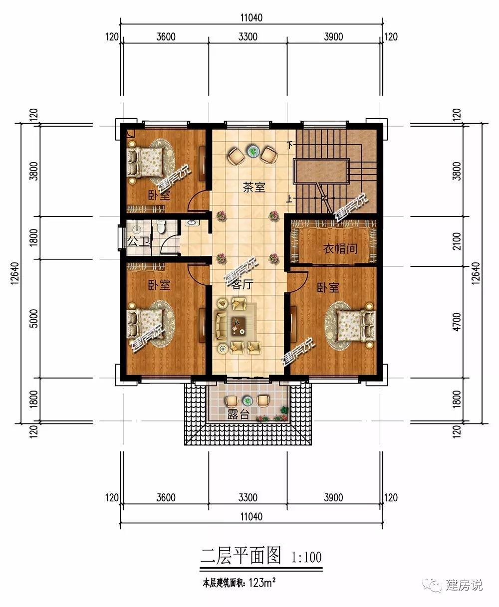 二层:3间卧室,大小适宜;茶室的设置,便于培养心境与打发空闲时光;客厅外的阳台设计,便于通风与采光。