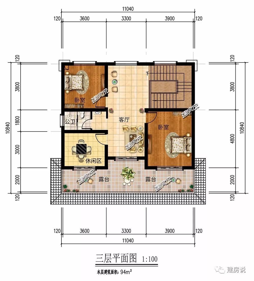 三层:卧室设置充裕;休闲区给家人提供休闲娱乐的场所;宽敞露台,晾晒、观景两不误。