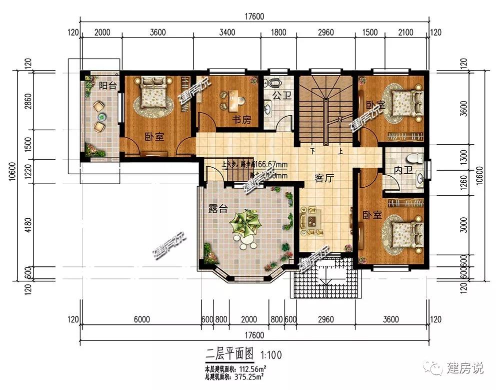 二层:设有3间卧室,主次分明;宽敞露台,适合晾晒,打造空中花园;书房满足家人办公学习的需求。