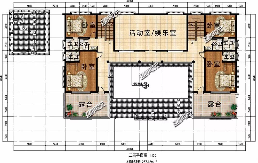 二层:设有4间卧室,主次分明;活动室满足家人娱乐活动;宽敞露台适合晾晒和观景。