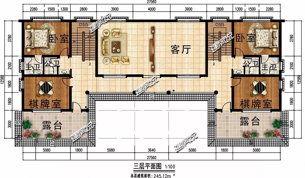 三层:设有2间卧室,客厅满足家人日常起居;棋牌室可供家人娱乐活动;露台适合晾晒衣物。