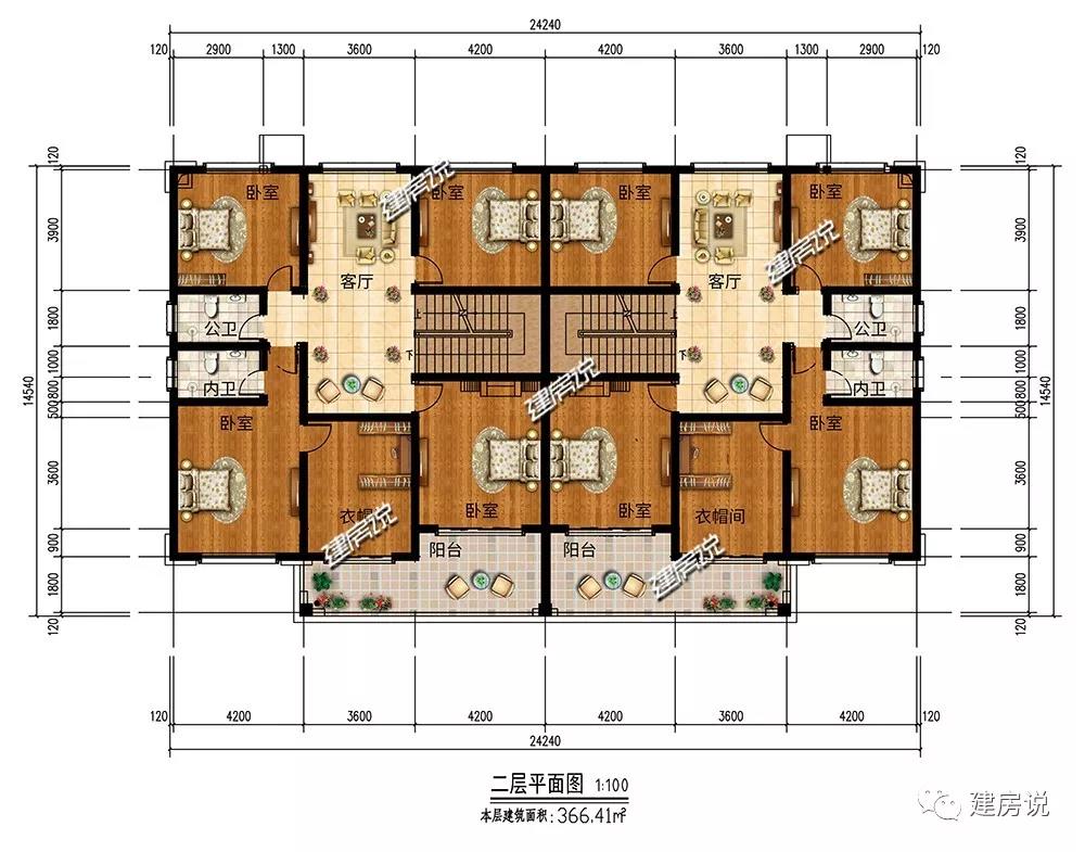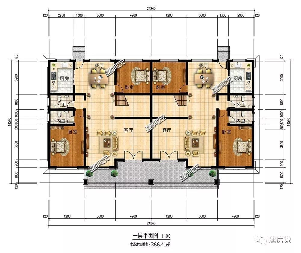 一层:别墅中间设墙,布局左右对称;宽敞客厅满足家人娱乐休闲;设有2个厨房餐厅,满足两兄弟的需求。