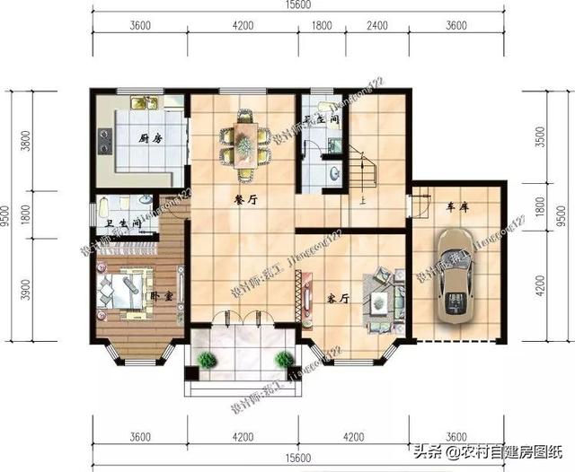 一层:室内功能通透大气,客厅餐厅空间非常宽敞,南北通透。主卧室朝南,并带有卫生间,提高了家居的舒适感。车库比较独立,实用性强。