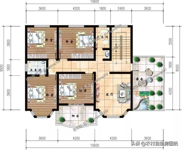 三层:设计4室1厅2卫和露台,三层共7间卧室,足够农村一大家子住。