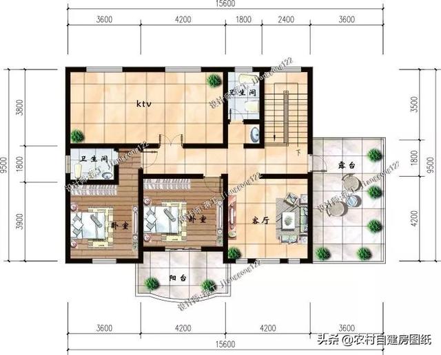 二层:设计有2间卧室,2个卫生间、客厅,一间非常大的KTV室和屋顶露台。