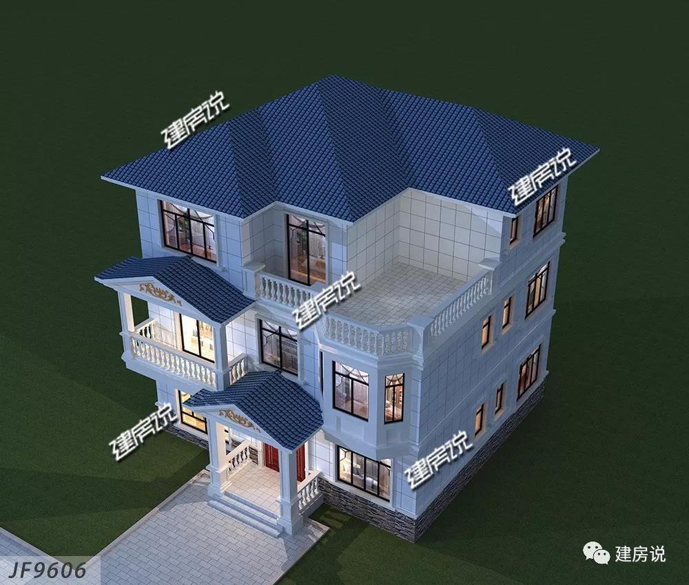 别墅外墙以白色真石漆装饰,屋顶是蓝色琉璃瓦,使用精致山花点缀墙面,再配上户型采光窗,使别墅整体简约而不简单。