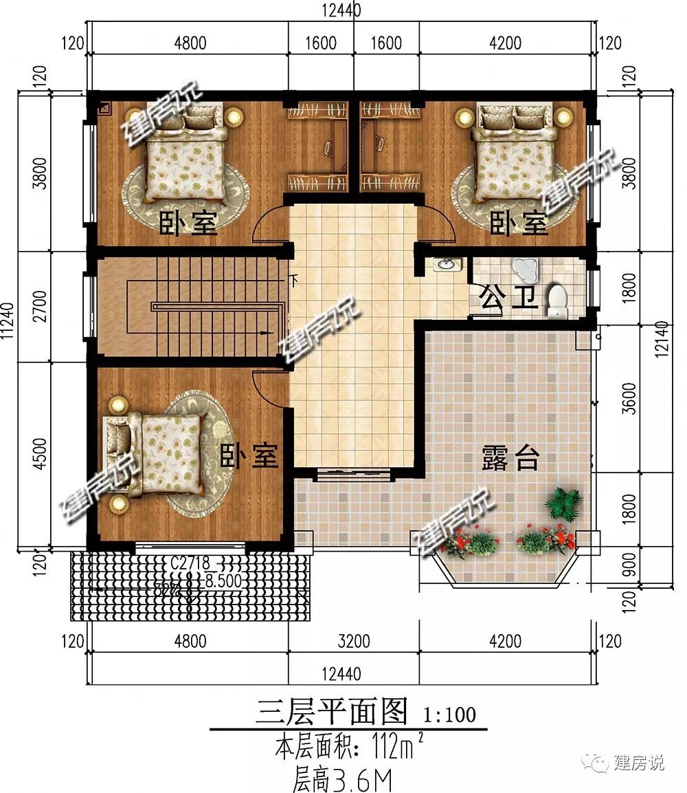 三层:卧室设置充裕,居住无忧;露台面积宽敞,便于通风采光、观景晾晒等。