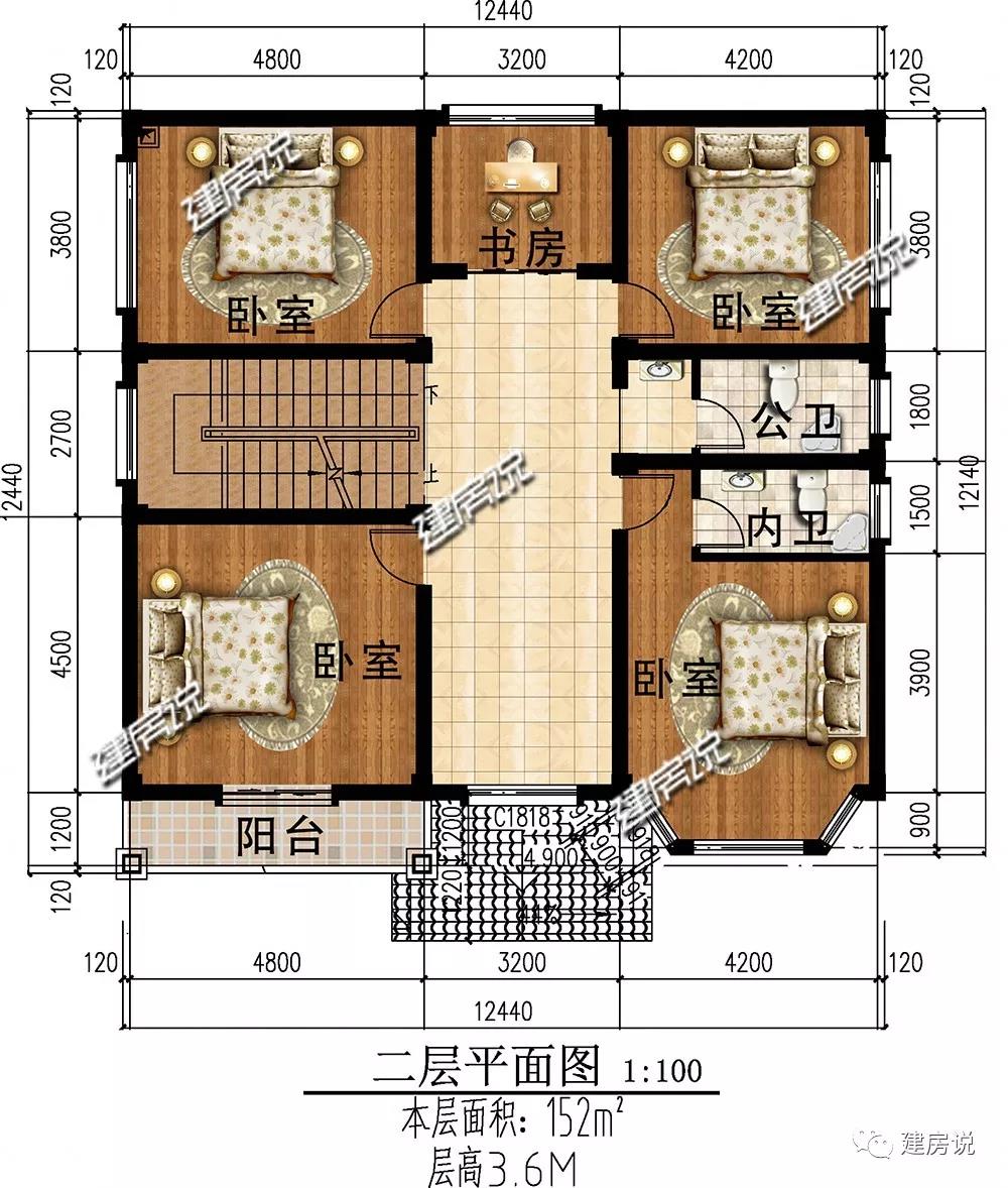 二层:4个卧室主次分明;卧室外的阳台设计,利于通风与采光;书房为学习、办公创造良好的环境。