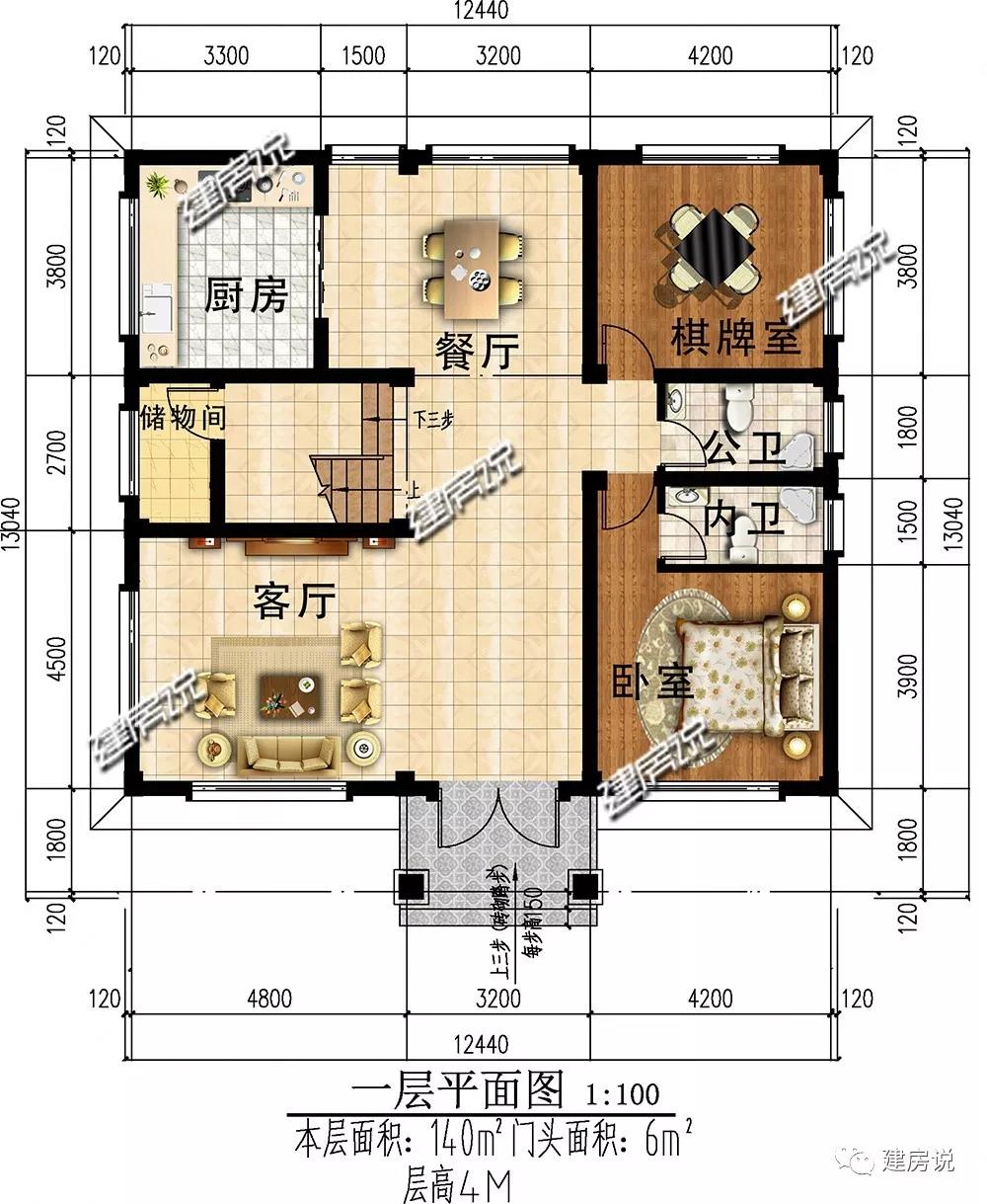 一层:入户即宽敞的客厅,生活便利;厨房、餐厅划分在一侧,布局合理;棋牌室丰富居家生活;储物间设置在楼梯下,空间利用得当。