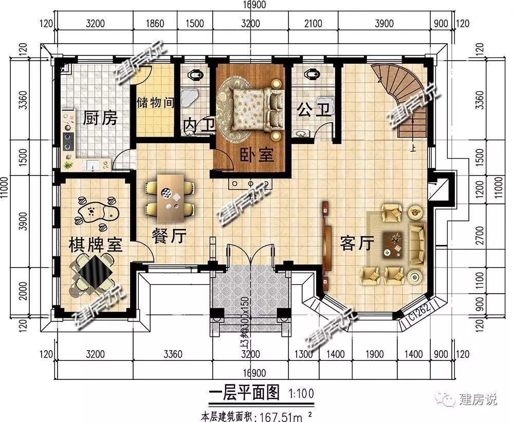 一层:客厅温馨舒适,方便接待好友;棋牌室的设置,丰富家居生活;储物间方便存储家庭杂物;卧室可做老人房。