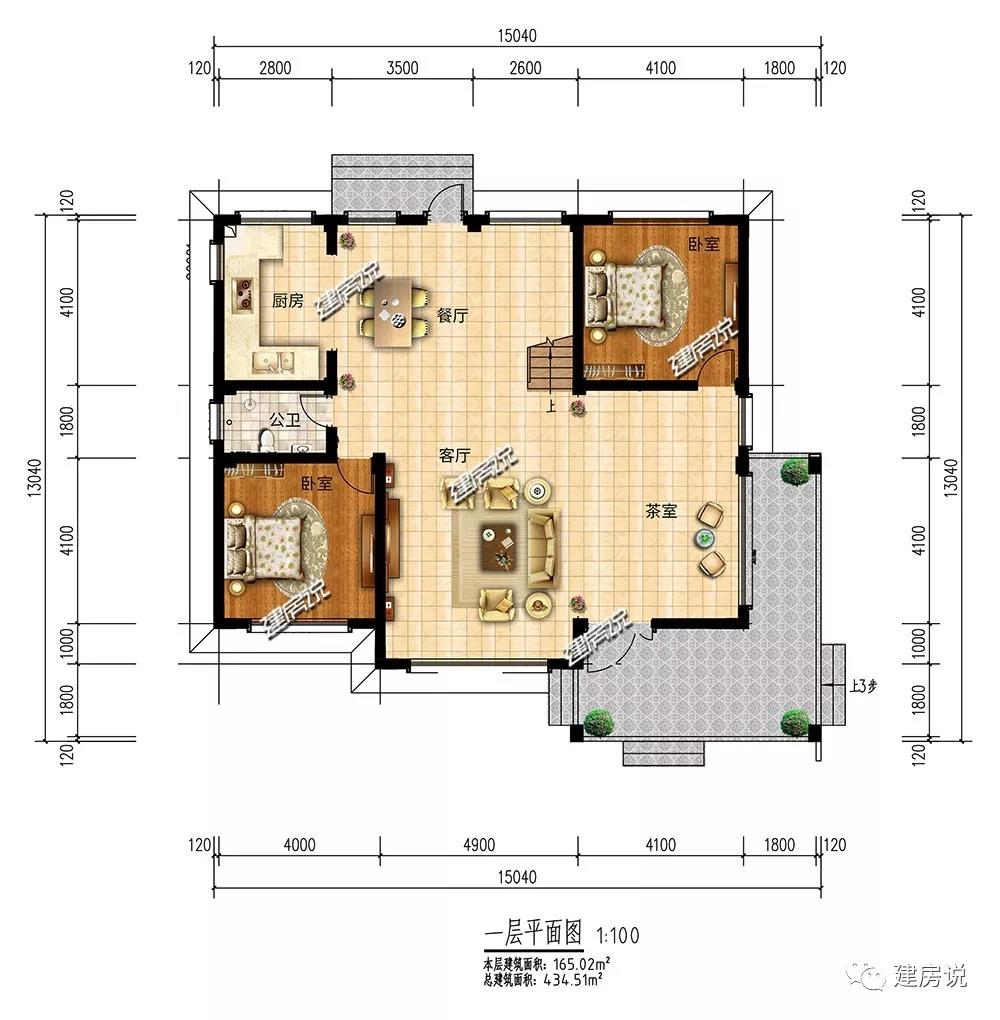 一层:布局疏散、空间大,不论日常活动,还是招待亲友都方便舒适;配2卧室,1公卫。