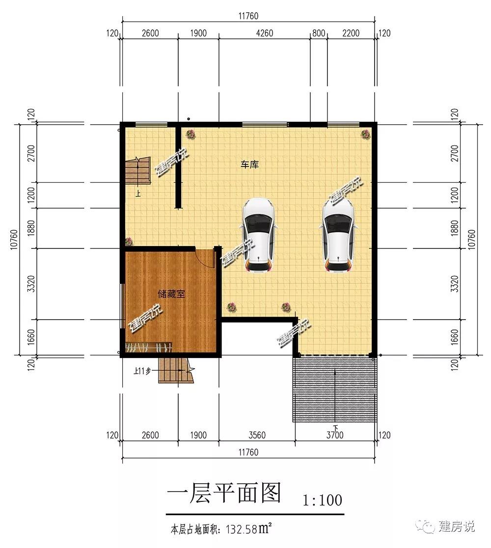 一层:宽敞车库,可自由泊车;储藏室方便存取家庭生活杂物。