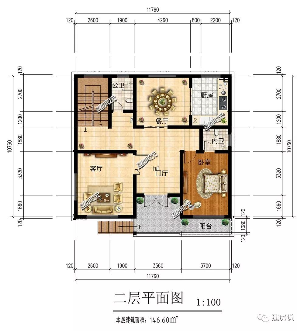 二层:设有1间主卧,连接阳台,光线充足;宽敞客厅方便家人沟通感情;厨房与餐厅相连,干净卫生。
