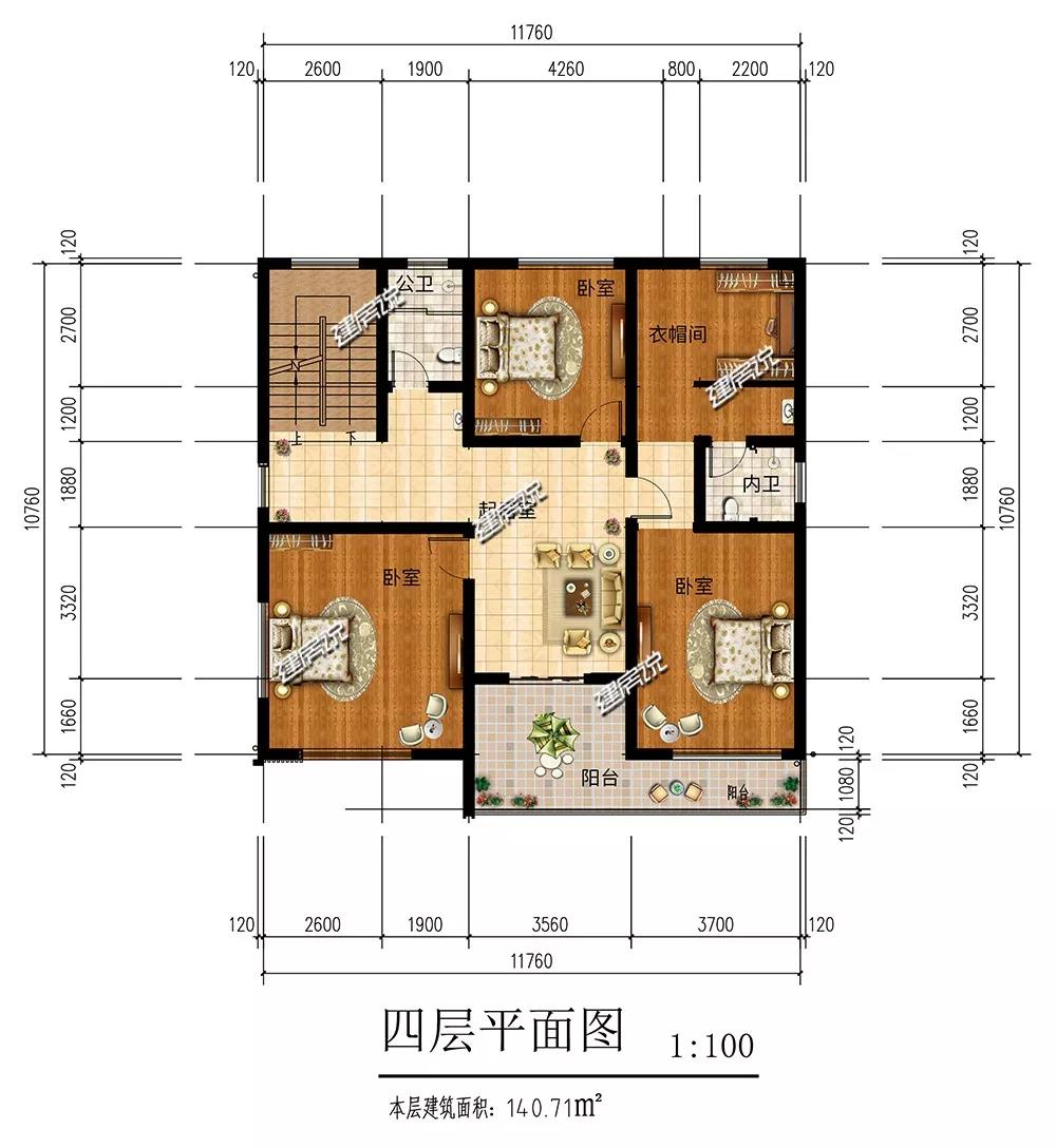 四层:设有3间卧室,主卧配有衣帽间,功能齐全;起居室方便家人沟通感情;宽敞阳台可晾晒衣物。