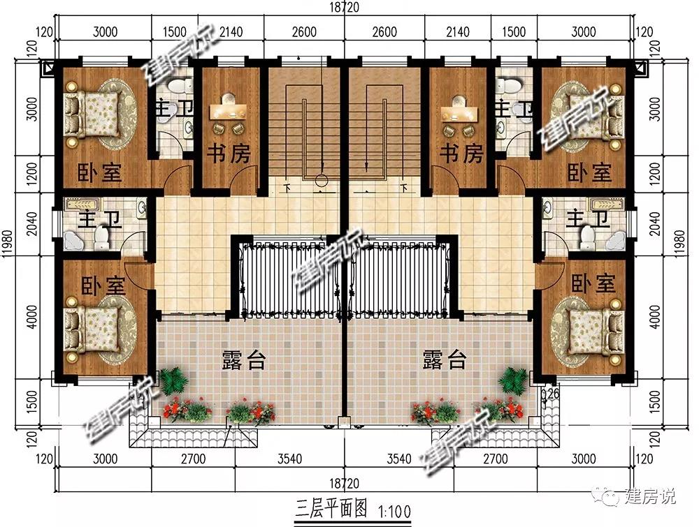 三层:左右功能设置对称,设有两间卧室,1间书房,1个大露台,居住温馨、舒适舒心。