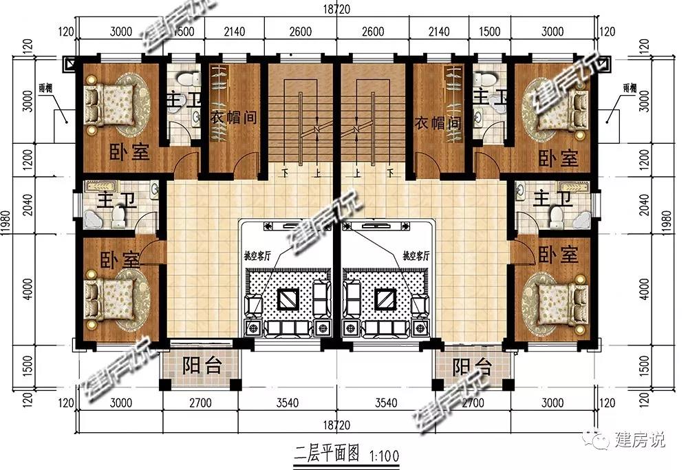 二层:左右布局一致,设有2个卧室,1个衣帽间,一个挑空客厅;阳台的设计利于通风与采光。