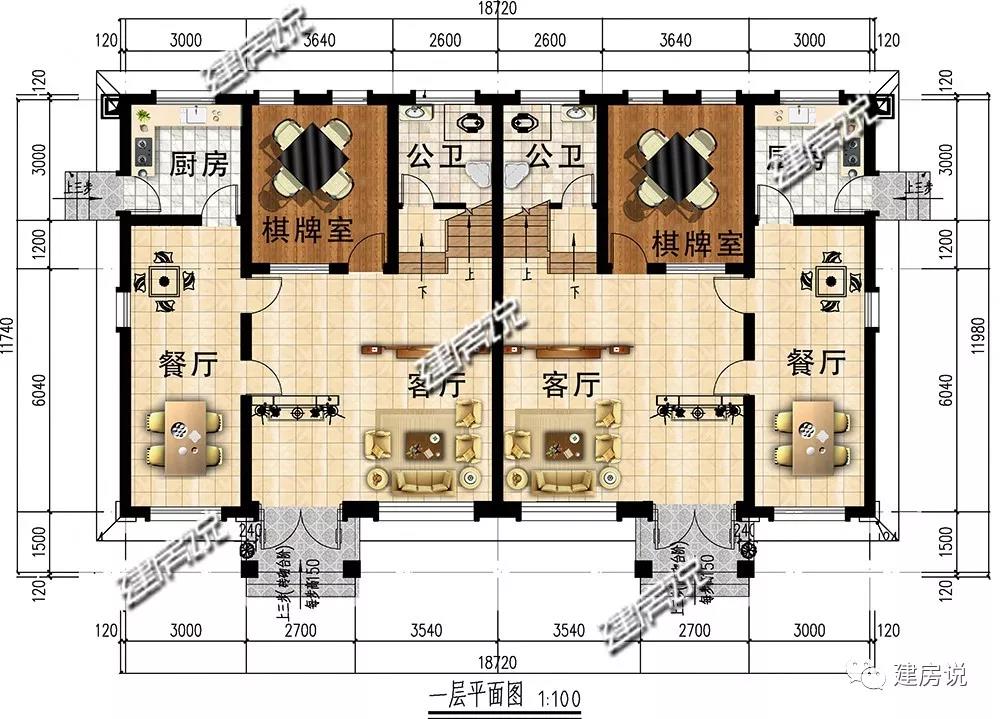 一层:入户设有神位,符合农村生活习俗;厨房、餐厅划分在一侧,布局合理;棋牌室丰富居家生活。
