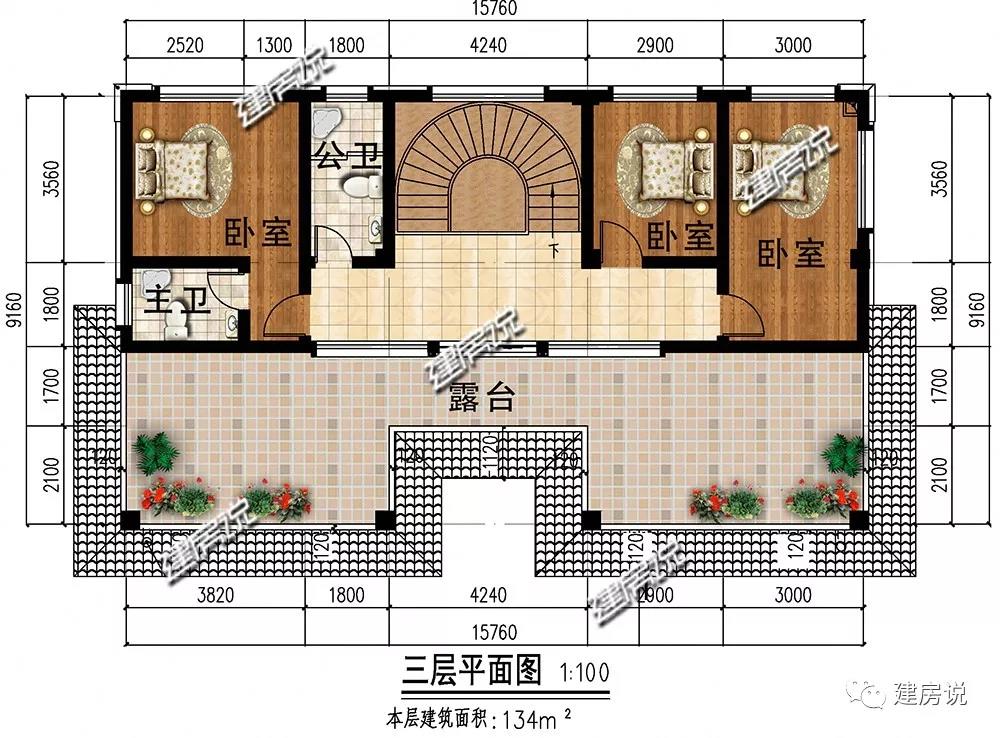 三层:设有3间卧室,主次分明;宽敞露台适合晾晒衣物,种植花草,别是一番美景。