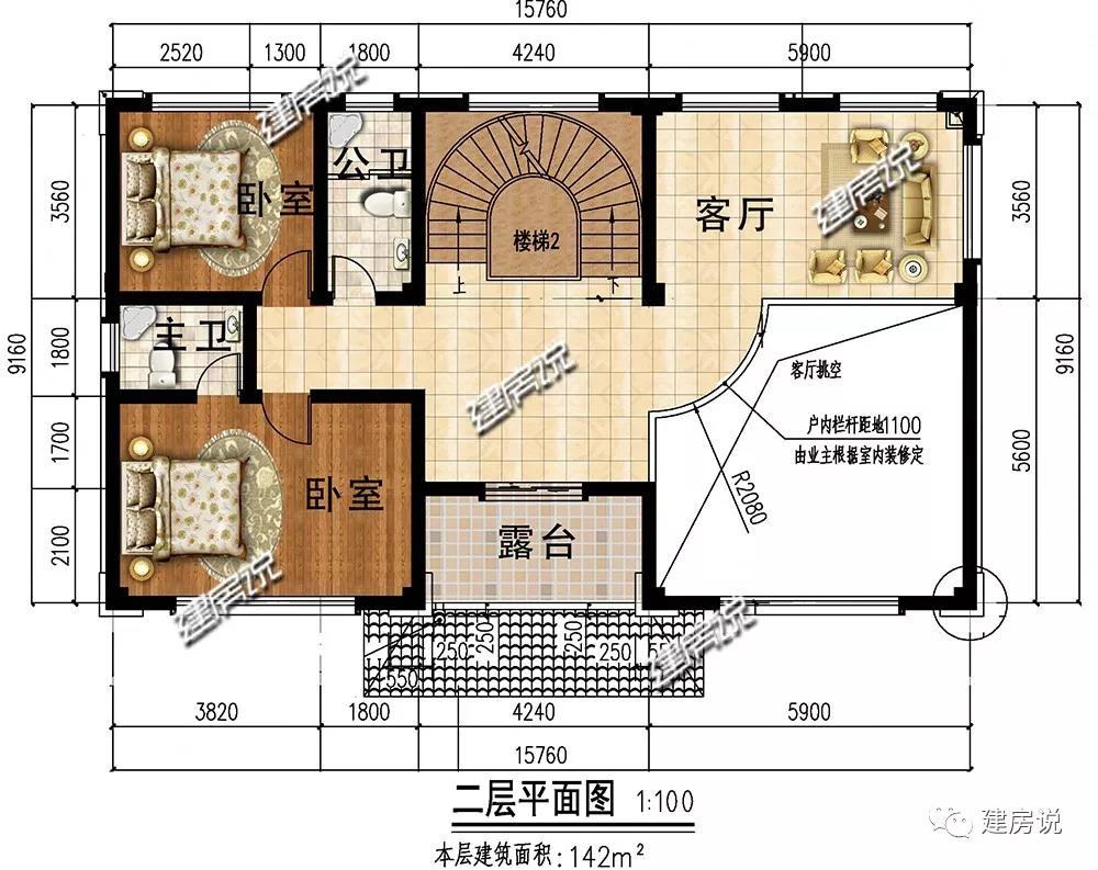 二层:挑空客厅尽显空间的大气,客厅方便家人沟通感情;设有2间卧室,主次分明;露台可眺望户外美景。