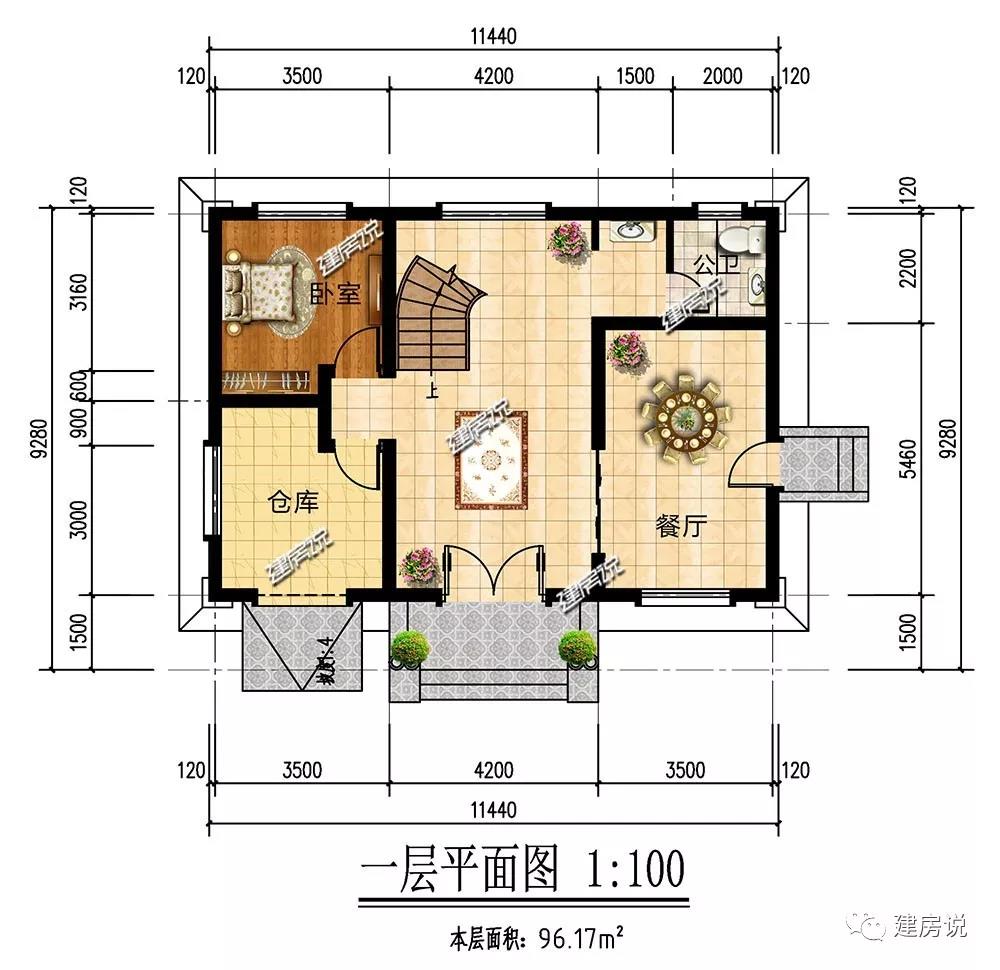 一层:厨房单独建造,餐厅开侧门通往厨房,隔离油烟;卧室可做老人房;仓库可做车库,与室内相通,方便快捷。