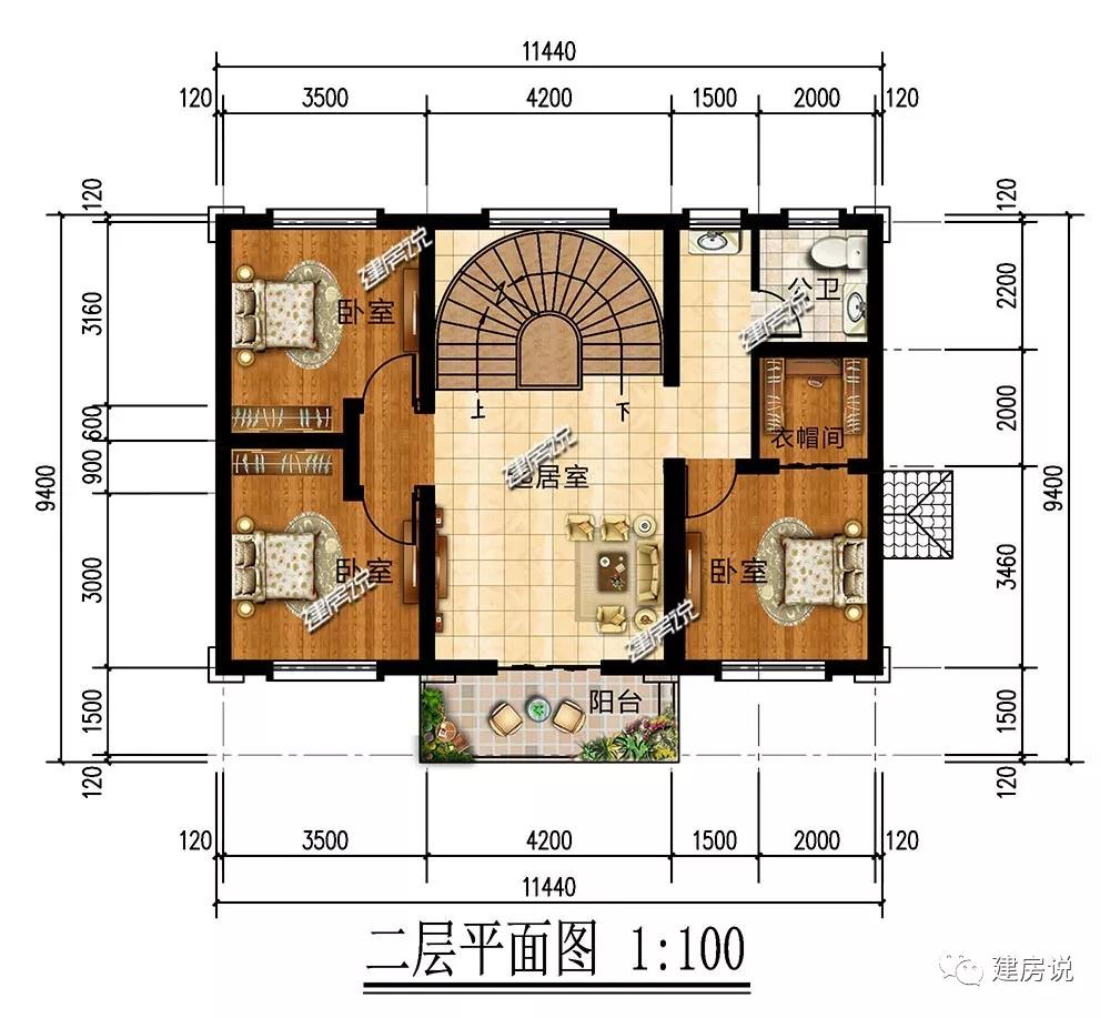 二层:3间卧室,主次分明;起居室促进家人交流;阳台设置,便于欣赏乡村美好景色。