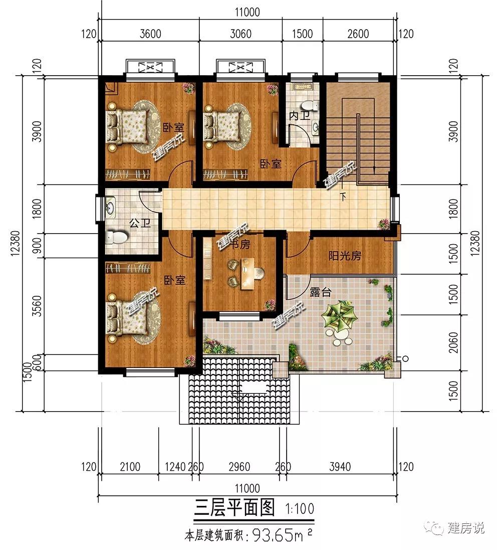 三层:卧室设置充裕;阳光房让家人尽情沐浴阳光;书房设置在静区,为学习、工作提供一个良好的环境;露台宽敞,观景、晾晒两不误。