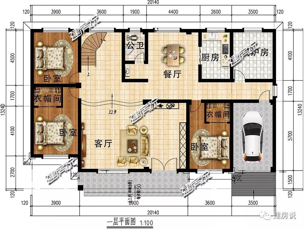 一层:客厅宽敞,方便接待好友;餐厅、厨房、锅炉房划分一侧,布局合理;3卧室,大小适中;车库便利生活,方便停车。